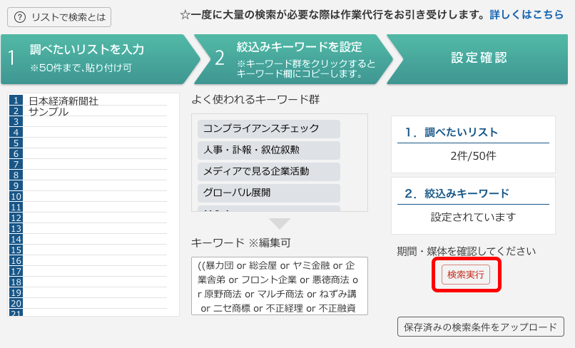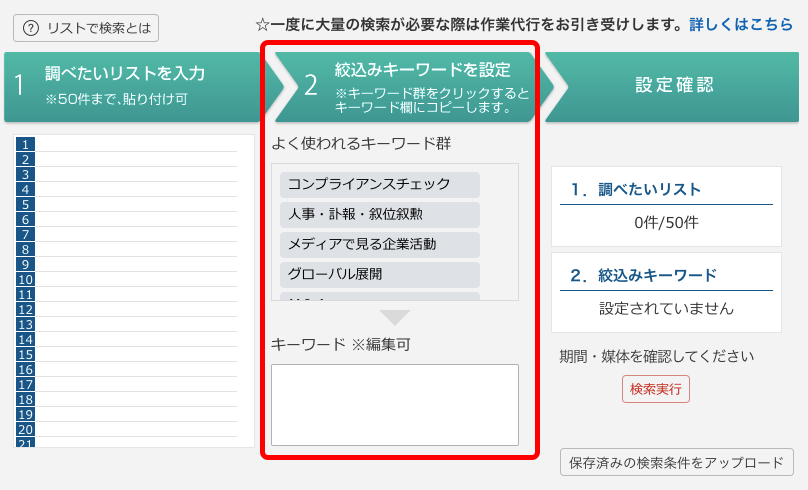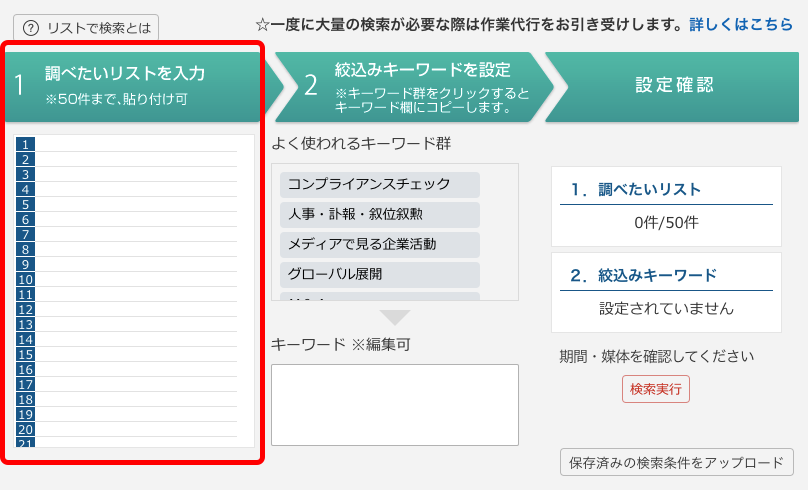 企業名や人名、都道府県名などお手持ちのリストや、検索したいキーワードを「調べたいリスト」欄に入力します。