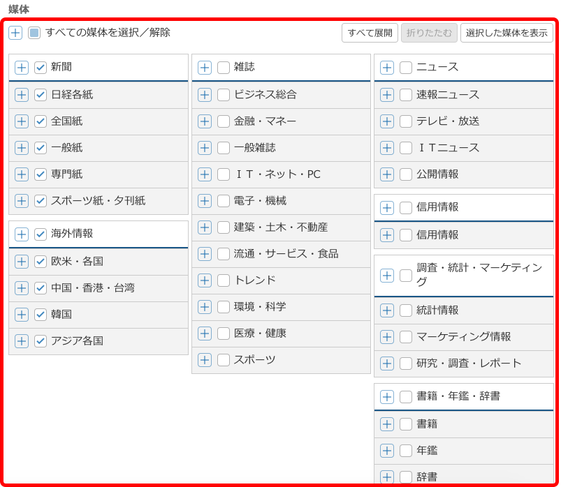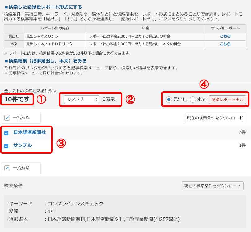 ※ 記録レポートの出力には、レポート料金(2000円)と各記事の見出し表示料金(「見出し」を選択した場合)、または各記事の見出し表示料金と本文表示料金(「本文」を選択した場合)が課金されます。