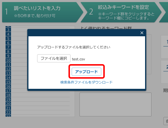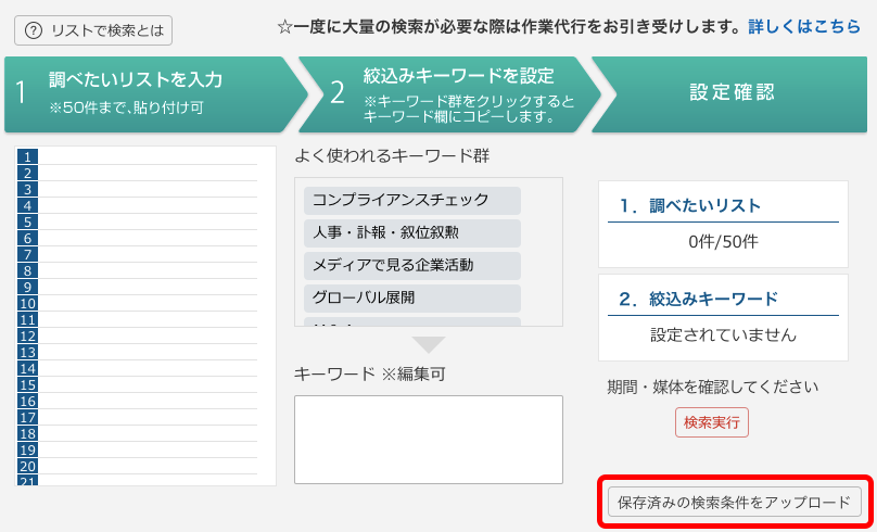 ※このページからも、「現在の検索条件をダウンロード」から設定した検索対象リスト、キーワード群、検索条件をダウンロードできます。